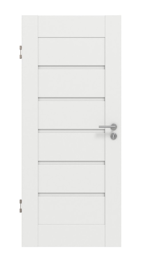 Biała powierzchnia CPL sprawia, że drzwi te są modelem, który można łatwo dopasować do otoczenia. Dzięki matowemu wykończeniu uzyskuje się subtelny wygląd. Pomiędzy drewnianymi deskami znajdują się wąskie panele HDF, które poprawiają ogólny wygląd.