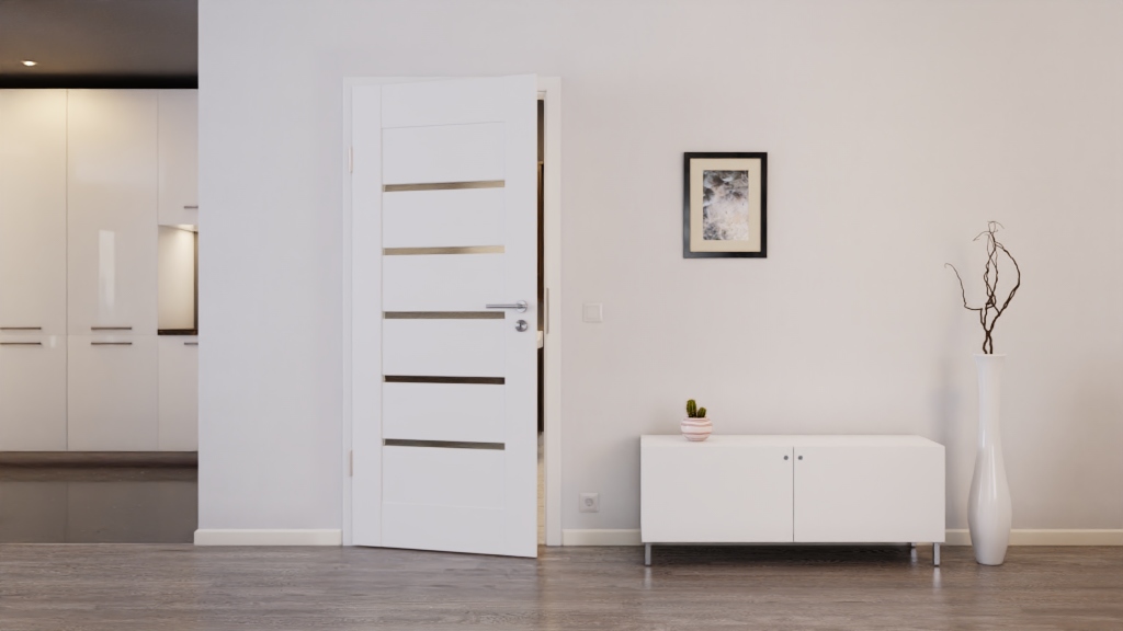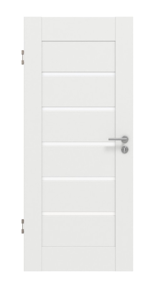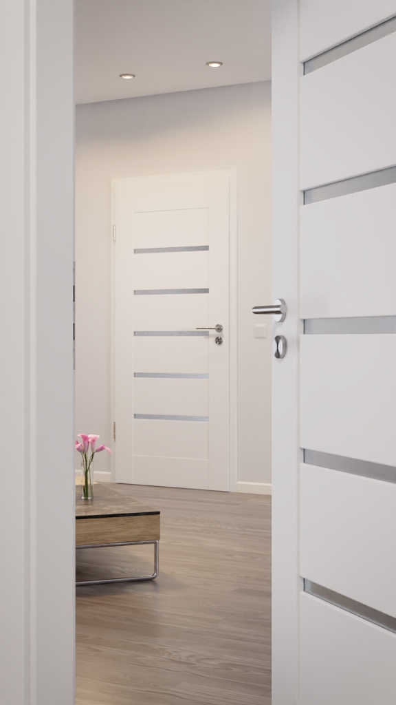 Drzwi można zintegrować z wieloma rodzajami wystroju wnętrz, ponieważ mają białą powłokę CPL. Matowanie sprawia, że wykończenie wizualne jest dyskretne. Delikatny dopływ światła zapewnia satynowane szklenie o grubości 4 mm, wbudowane między deski.