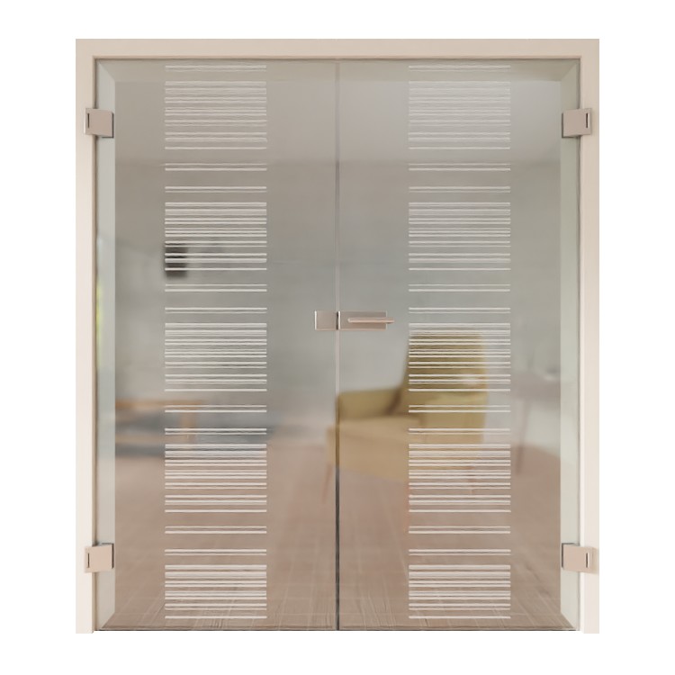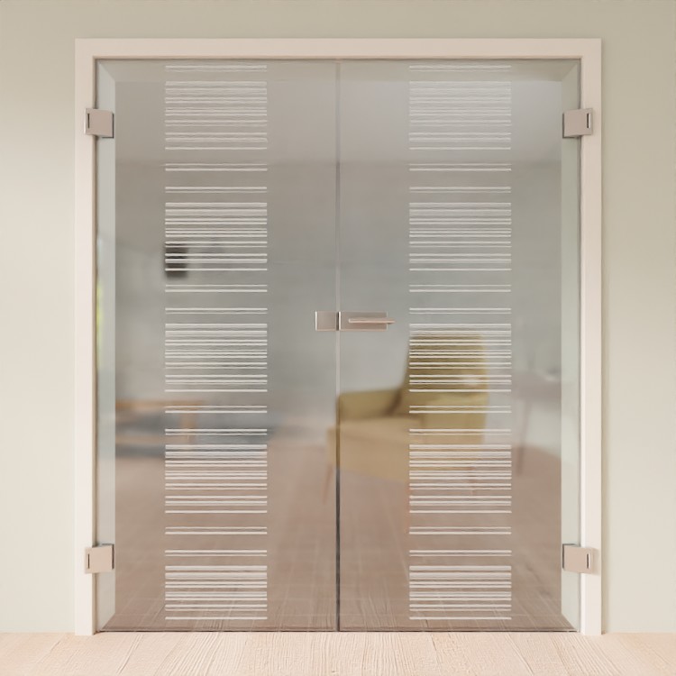 Drzwi dwuskrzydłowe o pomysłowym wzornictwie zapewniają dużo światła w wnętrzu. Matowe poprzeczne paski są nadrukowane pośrodku skrzydeł drzwiowych. Linie mają różną grubość i są rozmieszczone w różnych odstępach.