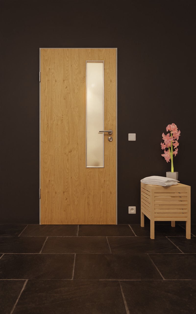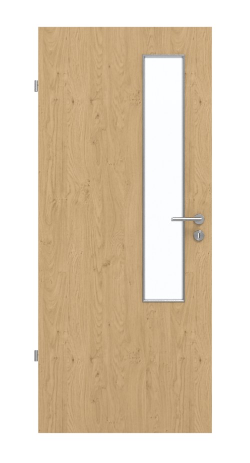 Krótkie, prostokątne przeszklenie o szerokości zaledwie 20 cm znajduje się po stronie zamka skrzydła drzwiowego. Dzięki realistycznemu wzorowi dekor Authentic Asteiche stanowi przekonującą alternatywę dla prawdziwego drewna. Wytrzymała warstwa HPL jest odporna na ścieranie, uderzenia i zarysowania oraz wyjątkowo odporna na działanie światła.
