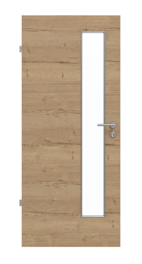 Prostokątne przeszklenie po stronie zamka w skrzydle drzwiowym ma szerokość prawie 20 cm. Na dekorze Authentic Risseiche spotykają się delikatne i wyraziste usłojenia, które tworzą nastrojową kompozycję. Powstaje naturalny i rustykalny wzór drewna w układzie poprzecznym. Wytrzymała i odporna na światło warstwa wierzchnia HPL jest odporna na zarysowania i ścieranie i została zaprojektowana z myślą o codziennym intensywnym użytkowaniu.