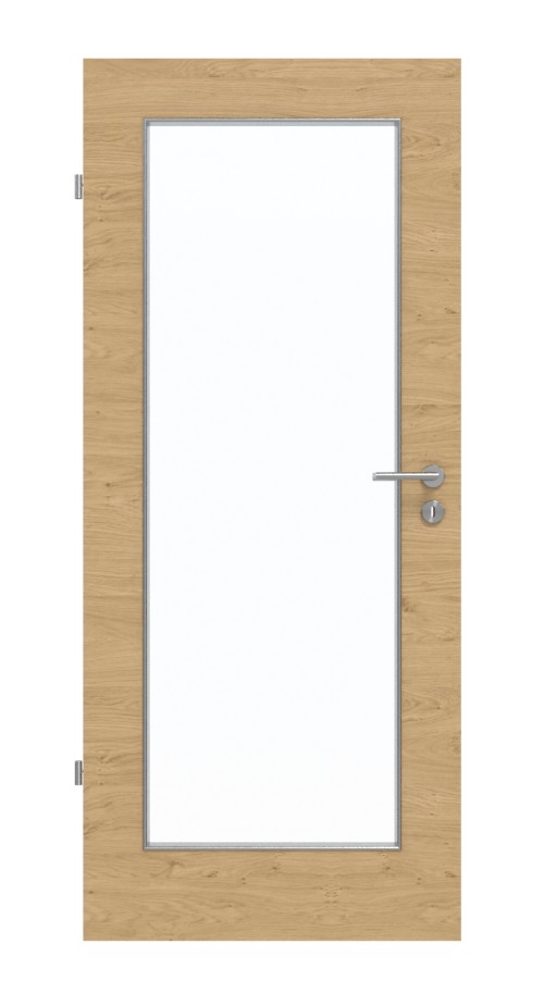 Skrzydło drzwiowe zdobi duże przeszklenie. Prostokąt jest otoczony listwami przyszybowymi. Atrakcją wizualną jest piękny dekor drewna o powierzchni authentic dąb sękaty, na którym rozciągają się poziome, drobne usłojenia. Wytrzymała i odporna na światło warstwa wierzchnia HPL jest odporna na zarysowania i ścieranie i została zaprojektowana z myślą o codziennym intensywnym użytkowaniu.