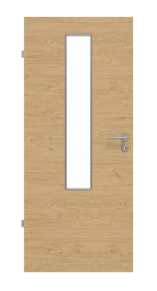 Wąskie, prostokątne przeszklenie w wykonaniu o niewielkich rozmiarach podkreśla środek skrzydła drzwiowego. Przyjemny wygląd drewna w dekorze poprzecznym Authentic Asteiche zyskuje nowoczesny charakter dzięki poziomemu układowi desek. Zarysowania, ścieranie i uderzenia nie mają wpływu na niezwykle wytrzymałą powierzchnię HPL, odporną na działanie popularnych środków czyszczących.