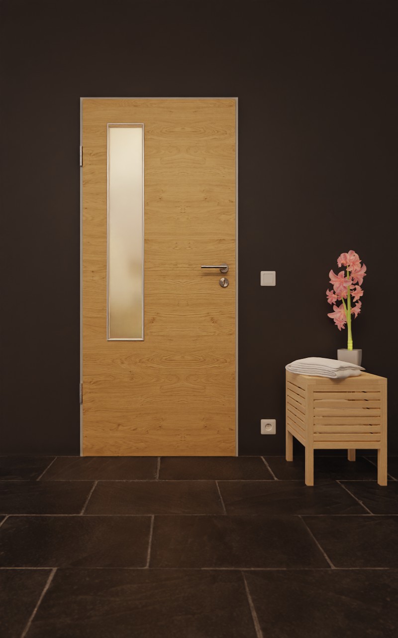 Po stronie zawiasów skrzydła drzwiowego znajduje się prostokątne przeszklenie. Na całej powierzchni dekoracji Authentic Asteiche widoczne są naturalne słoje drewna. Wytrzymały dekor HPL jest odporny na działanie światła, zarysowania, uderzenia i ścieranie i można go łatwo czyścić za pomocą dostępnych w handlu środków czyszczących.