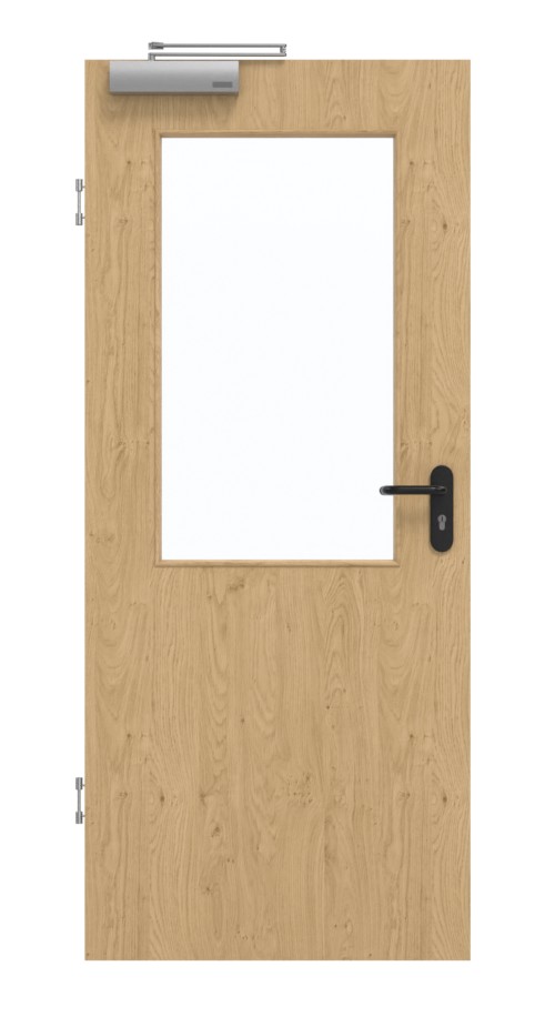 Skrzydło drzwiowe, zawiasy, zamek cylindryczny, przeszklenie, samozamykacz, obniżana uszczelka podłogowa, czarny plastikowy uchwyt.