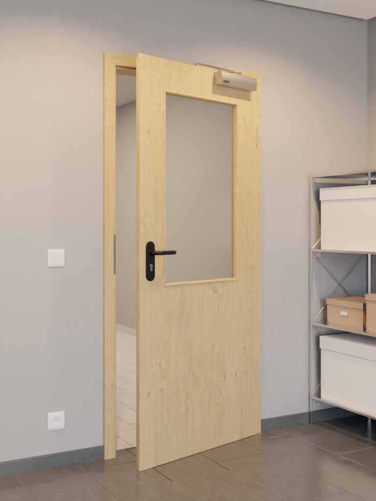 Rama z litego drewna ze stabilizatorem wraz z płytą wiórową pełną i warstwą wierzchnią z HDF tworzy stabilną konstrukcję. Zgodnie z normą DIN 18095 dotyczącą drzwi dymoszczelnych drzwi są wyposażone w samozamykacz drzwiowy górny i opuszczaną uszczelkę podłogową.