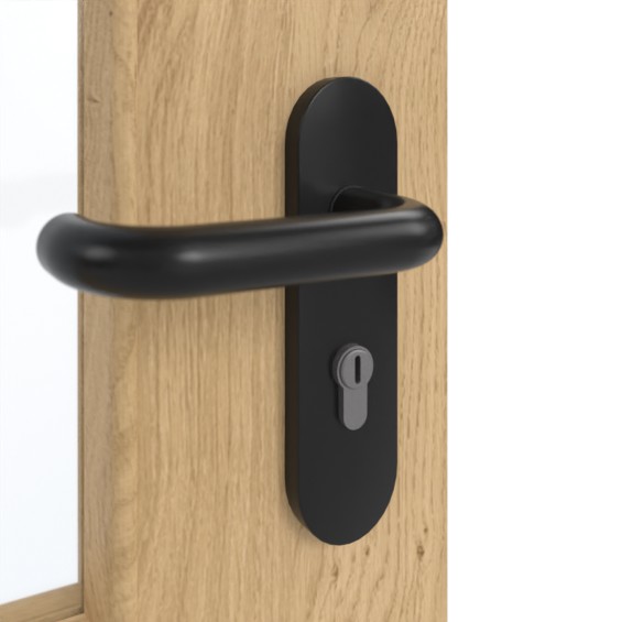 Standardowy zakres dostawy obejmuje skrzydło drzwiowe, klamkę z tworzywa sztucznego, zamek PZ, dwa trzyczęściowe zawiasy, samozamykacz drzwiowy górny i opuszczaną uszczelkę podłogową.