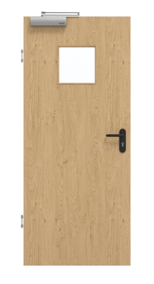 Skrzydło drzwiowe, zawiasy, zamek cylindryczny, przeszklenie, samozamykacz, obniżana uszczelka podłogowa, czarny plastikowy uchwyt.