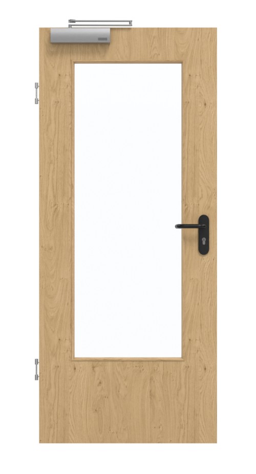 Wyposażona w warstwę wierzchnią HDF na płycie wiórowej pełnej w ramie z litego drewna wraz ze stabilizatorem, konstrukcja ta okazuje się być zaawansowana technicznie. Aby zapewnić pełną ochronę dymoszczelną, drzwi są wyposażone w samozamykacz drzwiowy górny i opuszczaną uszczelkę podłogową zgodnie z normą DIN 18095.