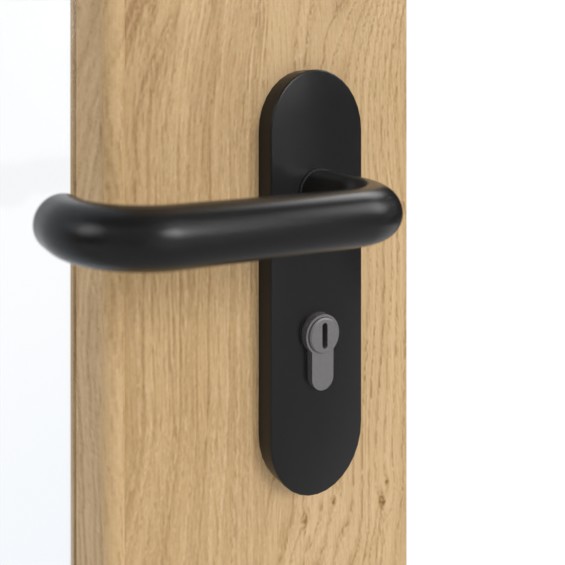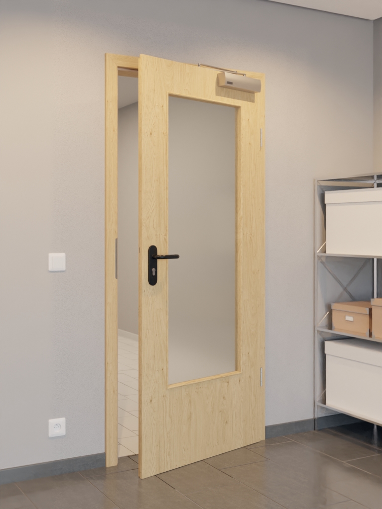 W standardzie zakres dostawy obejmuje skrzydło drzwiowe, klamkę z tworzywa sztucznego, zamek PZ, dwa trzyczęściowe zawiasy, samozamykacz drzwiowy górny oraz opuszczaną uszczelkę podłogową.