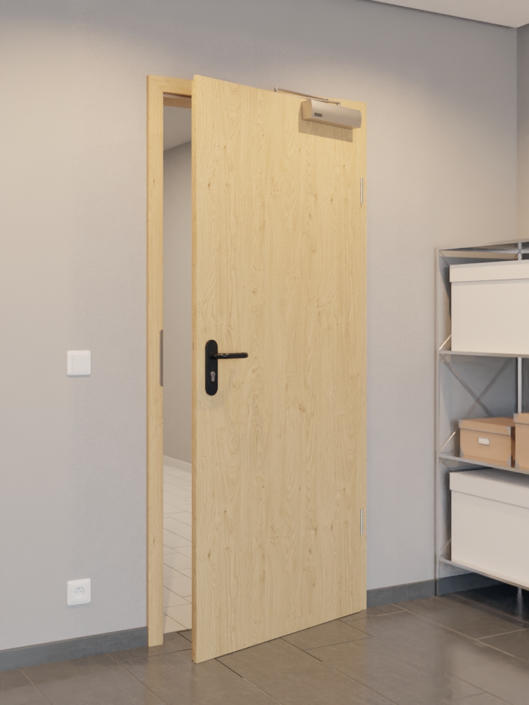 Rama z litego drewna ze stabilizatorem i płyta wiórowa pełna wraz z warstwą wierzchnią z płyty HDF o grubości 3 mm tworzą stabilną, niezawodną konstrukcję. Aby spełnić wymagania normy DIN 18095 dotyczącej drzwi dymoszczelnych, pakiet przeciwdymowy uzupełnia samozamykacz drzwiowy górny i opuszczana uszczelka podłogowa.