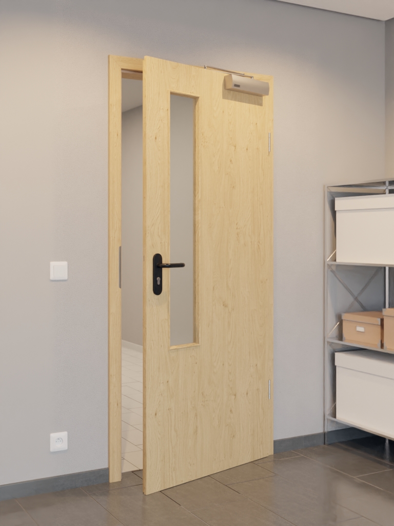 Solidne drzwi funkcjonalne z samoczynnym mechanizmem i uszczelką podłogową przeciw dymowi: