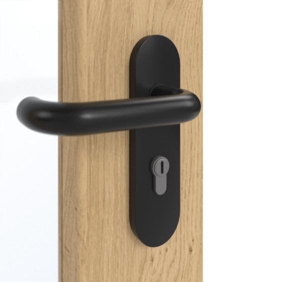 Standardowy zakres dostawy obejmuje skrzydło drzwiowe, klamkę z tworzywa sztucznego, zamek PZ, dwa trzyczęściowe zawiasy, samozamykacz drzwiowy górny i opuszczaną uszczelkę podłogową.