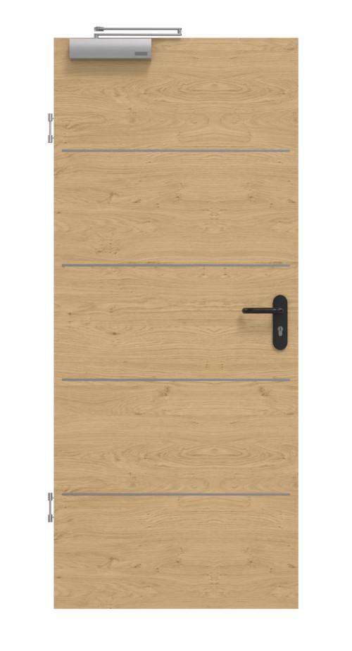 • Zakres dostawy: Skrzydło drzwiowe, zawiasy, zamek cylindryczny, samozamykacz, obniżana uszczelka podłogowa, czarny plastikowy uchwyt