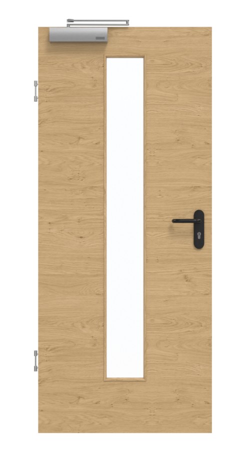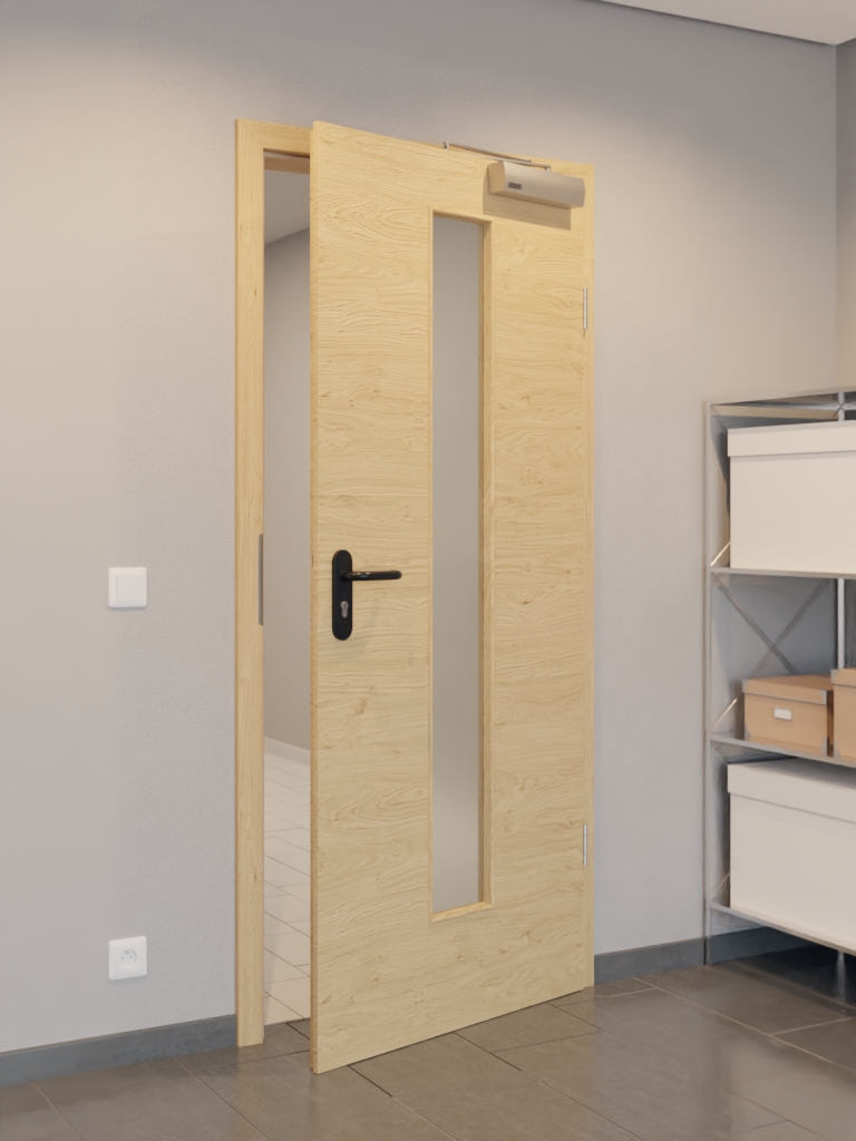 W pomieszczeniu wewnętrznym drzwi znajduje się solidna płyta wiórowa pełna w ramie z litego drewna ze stabilizatorem. Warstwa wierzchnia składa się z płyty HDF o grubości 3 mm. W połączeniu z samozamykaczem drzwiowym górnym i opuszczaną uszczelką podłogową drzwi spełniają wymagania normy DIN 18095 dla drzwi dymoszczelnych.