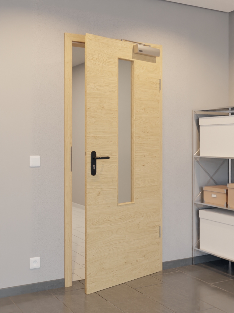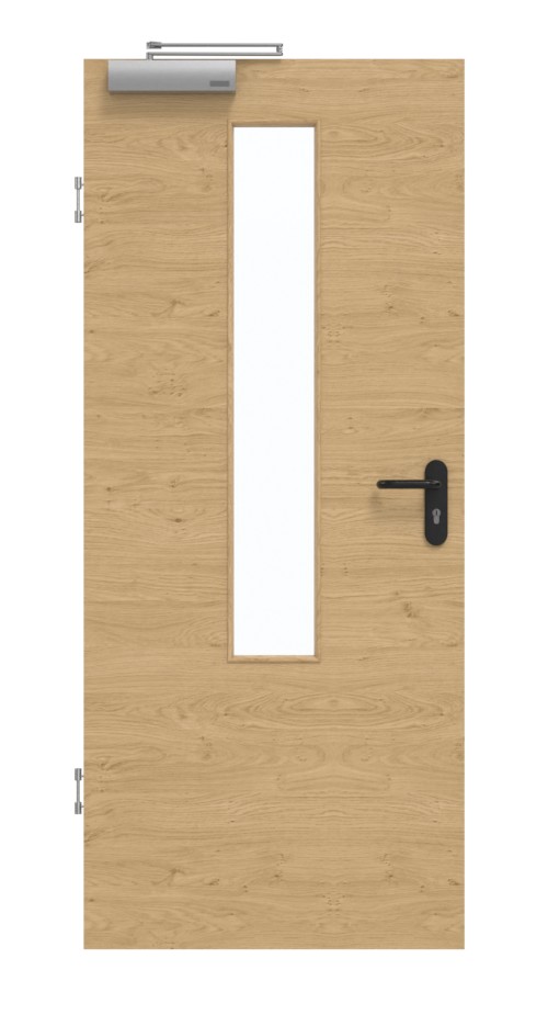 Konstrukcja składa się z płyty wiórowej pełnej i ramy z litego drewna wraz ze stabilizatorem. Płyta wierzchnia HDF o grubości 3 mm zaokrąglona dopełnia wnętrze drzwi. W połączeniu z samozamykaczem drzwiowym górnym i opuszczaną uszczelką podłogową drzwi spełniają wymagania normy DIN 18095 dla drzwi dymoszczelnych.
