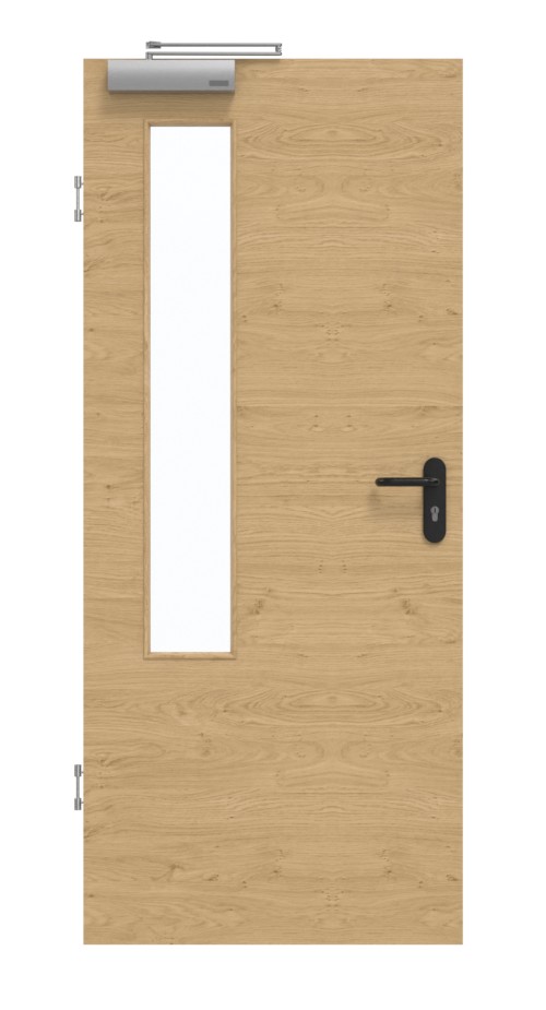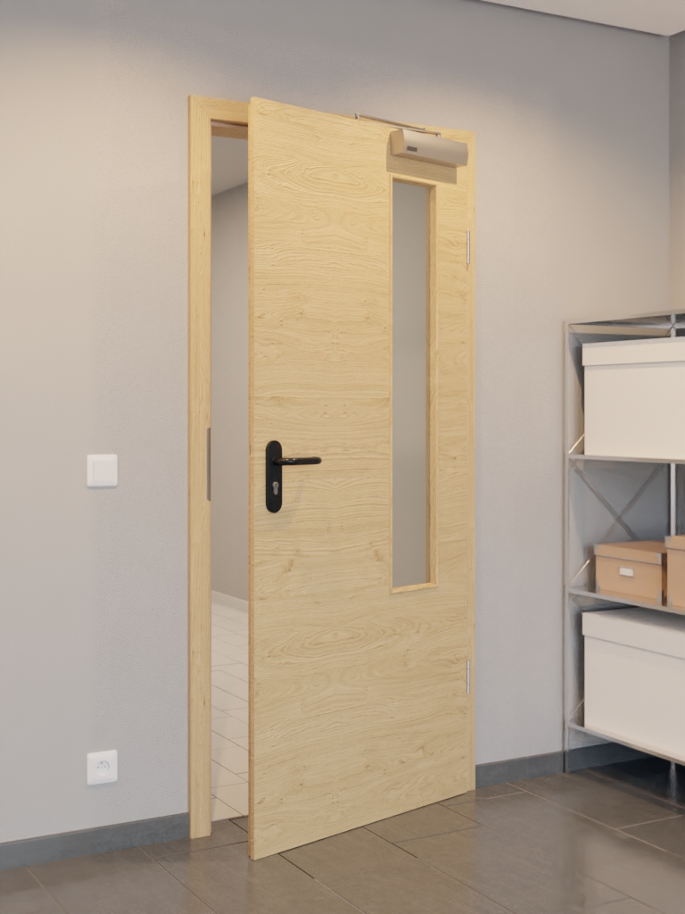 W pomieszczeniu wewnętrznym drzwi znajduje się solidna płyta wiórowa pełna w ramie z litego drewna ze stabilizatorem. Warstwa wierzchnia składa się z płyty HDF o grubości 3 mm. W połączeniu z samozamykaczem drzwiowym górnym i opuszczaną uszczelką podłogową drzwi spełniają wymagania normy DIN 18095 dotyczącej drzwi dymoszczelnych.