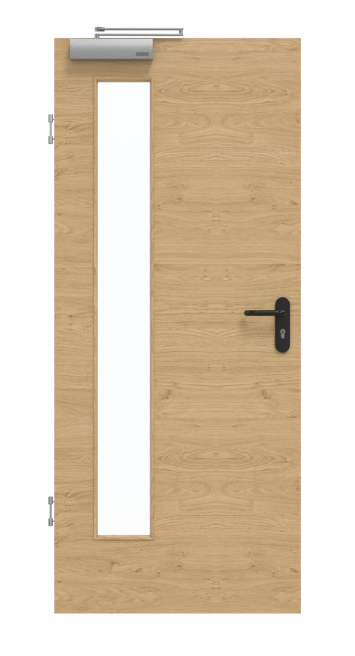 Skrzydło drzwiowe, zawiasy, zamek cylindryczny, przeszklenie, samozamykacz, obniżana uszczelka podłogowa, czarny plastikowy uchwyt.