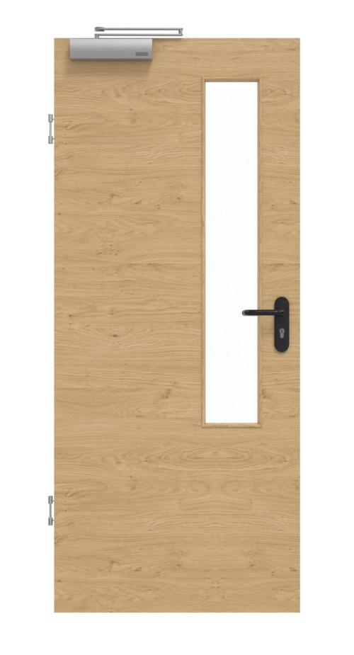 Skrzydło drzwiowe, zawiasy, zamek cylindryczny, przeszklenie, samozamykacz, obniżana uszczelka podłogowa, czarny plastikowy uchwyt.