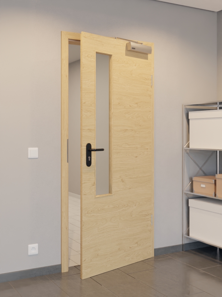 Ta zaawansowana technicznie konstrukcja posiada w pomieszczeniu wewnętrznym ramę z litego drewna wraz ze stabilizatorem i płytą wiórową pełną, a całość otacza płyta HDF o grubości 3 mm. Zgodnie z normą DIN 18095 model jest uzupełniony o samozamykacz drzwiowy górny oraz opuszczaną uszczelkę podłogową.