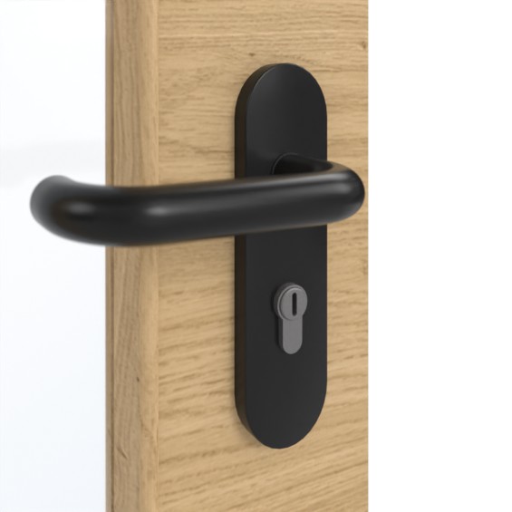 Standardowy zakres dostawy obejmuje skrzydło drzwiowe, klamkę z tworzywa sztucznego, zamek PZ, dwa trzyczęściowe zawiasy, samozamykacz nożycowy do drzwi górnych oraz uszczelkę dolną.