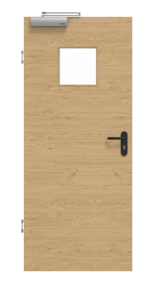 Skrzydło drzwiowe, zawiasy, zamek cylindryczny, przeszklenie, samozamykacz, obniżana uszczelka podłogowa, czarny plastikowy uchwyt.