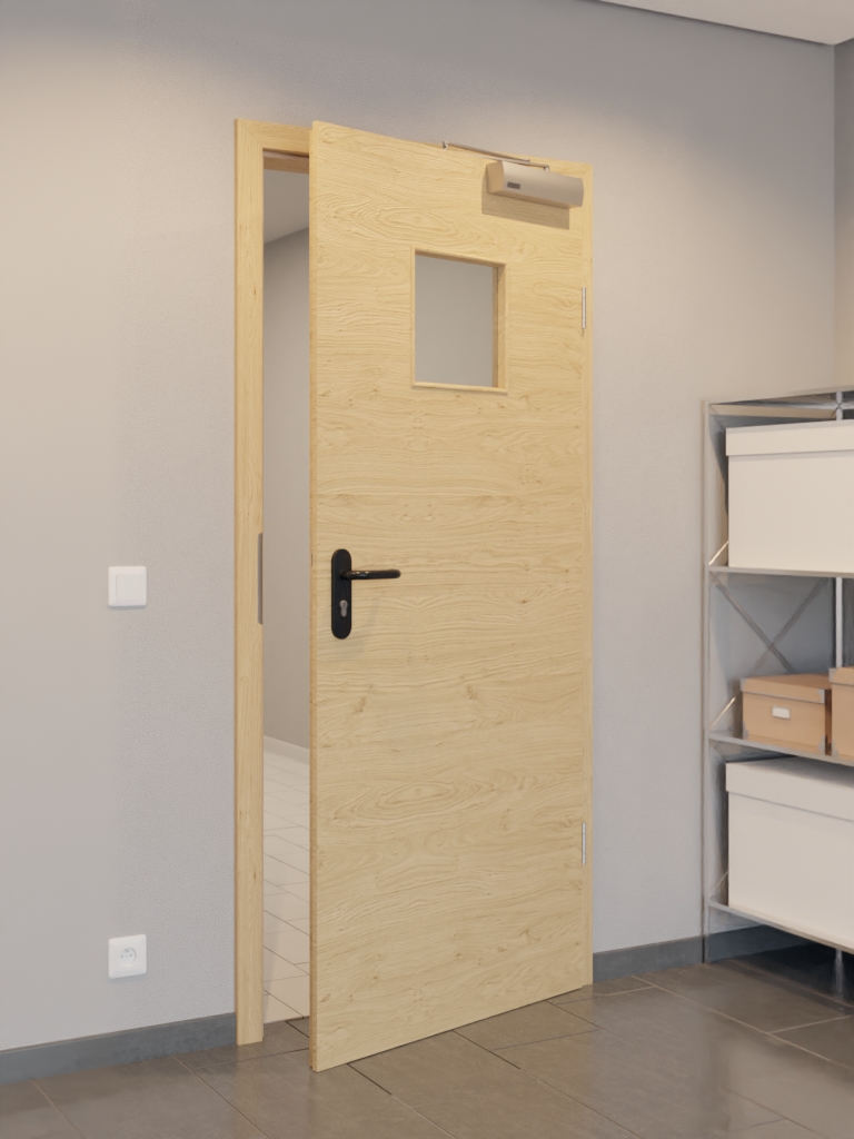 Konstrukcja składa się z ramy z litego drewna ze stabilizatorem, płyty wiórowej pełnej oraz płyty HDF o grubości 3 mm i wysokiej gęstości jako warstwy wierzchniej. Zgodnie z normą DIN 18095 model jest uzupełniony o samozamykacz drzwiowy górny oraz opuszczaną uszczelkę podłogową.