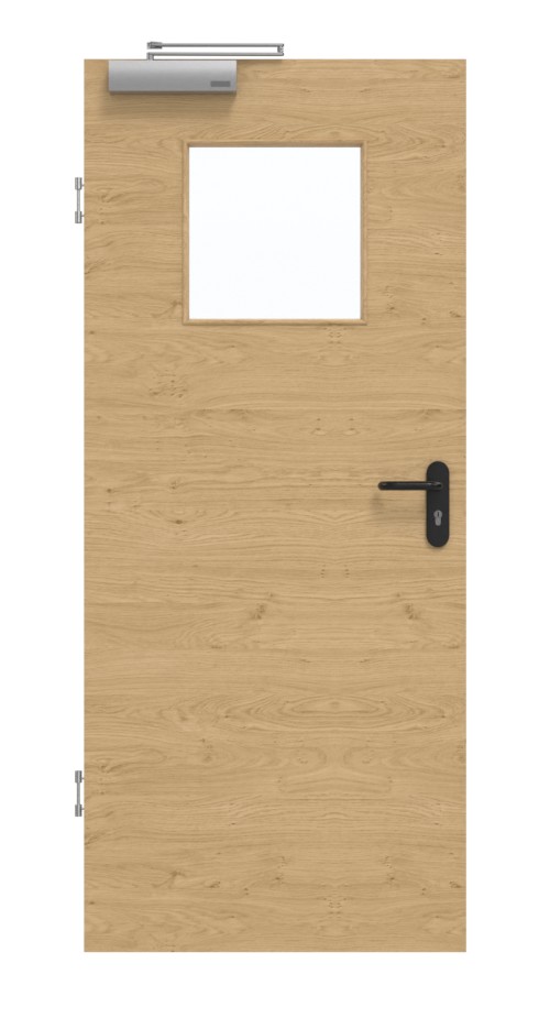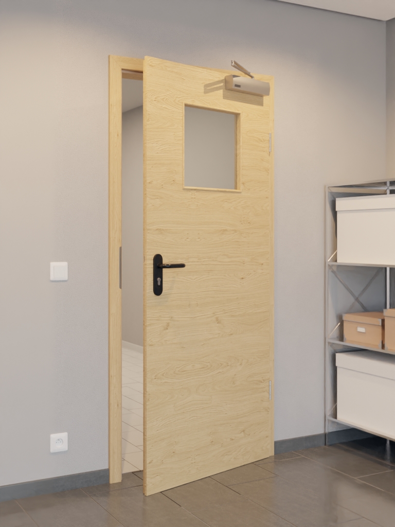 Wyposażona w warstwę wierzchnią HDF na płycie wiórowej pełnej w ramie z litego drewna wraz ze stabilizatorem, konstrukcja ta okazuje się być zaawansowana technicznie. Zgodnie z normą DIN 18095 dotyczącą drzwi dymoszczelnych konstrukcję uzupełnia samozamykacz drzwiowy górny i opuszczana uszczelka podłogowa.