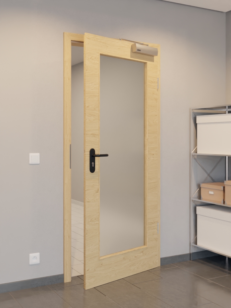 W standardzie zakres dostawy obejmuje skrzydło drzwiowe, klamkę z tworzywa sztucznego, zamek PZ, dwa trzyczęściowe zawiasy, samozamykacz drzwiowy górny oraz opuszczaną uszczelkę podłogową.
