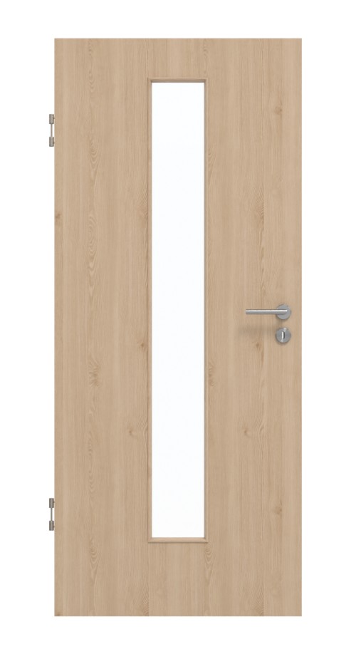 Dokładnie pośrodku skrzydła drzwiowego znajduje się przeszklenie o szerokości prawie 20 cm z zamontowanymi listwami przyszybowymi. Delikatne słoje rozciągają się na beżowym dekorze drewnianym Authentic Achat. Piękny design powłoki CPL pozostaje niezmieniony przez długi czas, ponieważ jest ona odporna na zarysowania i promieniowanie UV.