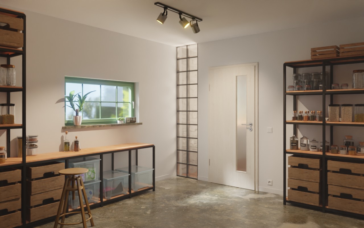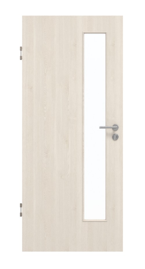 Nowoczesny wygląd podkreśla długi, wąski szklany wycięty fragment umieszczony obok klamki. Delikatne słoje nadają powierzchni naturalny wygląd drewna w kremowym odcieniu. Powierzchnia z tworzywa CPL jest łatwa w czyszczeniu i mniej podatna na zarysowania oraz uderzenia.