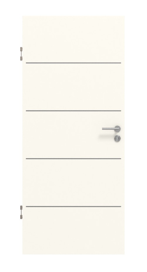 Cztery równomiernie rozmieszczone lizeny biegną poziomo wzdłuż skrzydła drzwi. Biel perłowa emanuje przyjemną elegancją. Dzięki swojej odporności na światło piękne wykończenie wizualne powłoki CPL pozostaje trwałe. Odporność na uderzenia i zarysowania sprawia, że nadaje się do codziennego użytku.