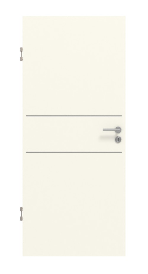 Dwie poziome lizeny otaczają klamkę od góry i od dołu. Na powierzchni drzwi wewnętrznych rozciąga się delikatny, naturalny odcień biały, który można łatwo dopasować do każdego wystroju wnętrza. Dzięki swoim wytrzymałym właściwościom warstwa wierzchnia CPL jest szczególnie odporna na zużycie i trwała. Jest odporna na zarysowania i uderzenia oraz łatwa w pielęgnacji.