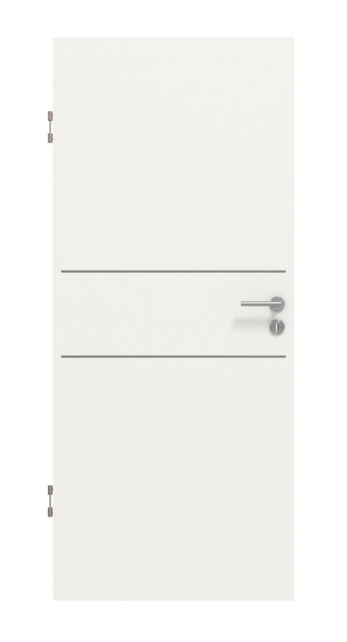 Nad i pod klamką biegną dwie eleganckie listwy w poprzek skrzydła drzwi. Jasny i zachęcający biały lakier 9016 doskonale prezentuje się w każdym pomieszczeniu. Dzięki odporności na zarysowania, uderzenia i promieniowanie UV łatwa w pielęgnacji powłoka CPL stanowi niezawodny i trwały wybór.