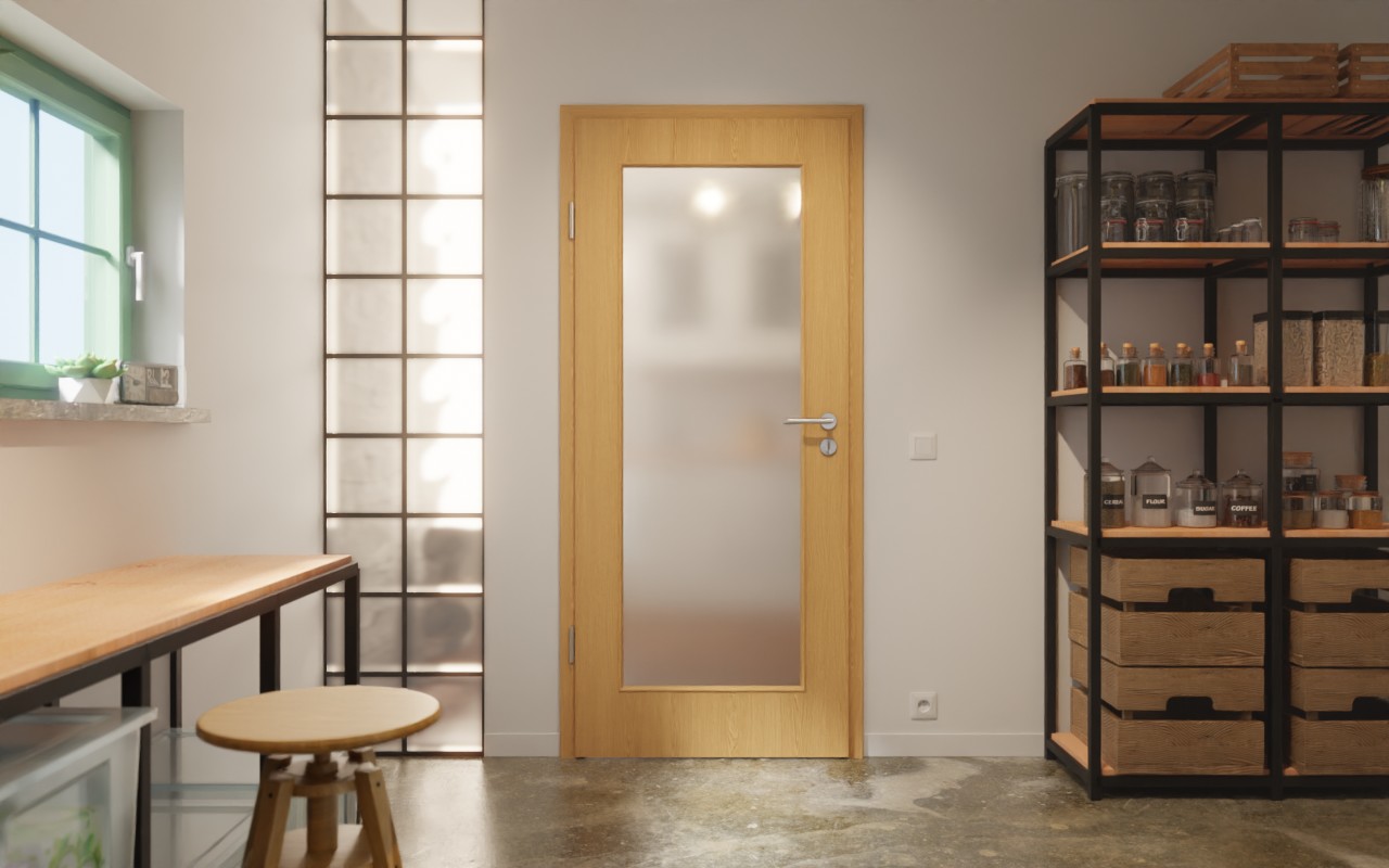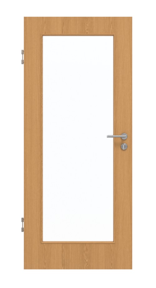 Duże przeszklenie w środku drzwi jest otoczone nałożonymi listwami szklanymi. Autentyczne usłojenie dekoru drewnianego dębu premium zapewnia przytulność. Łatwy w pielęgnacji materiał CPL jest odporny na wilgoć i promieniowanie UV.