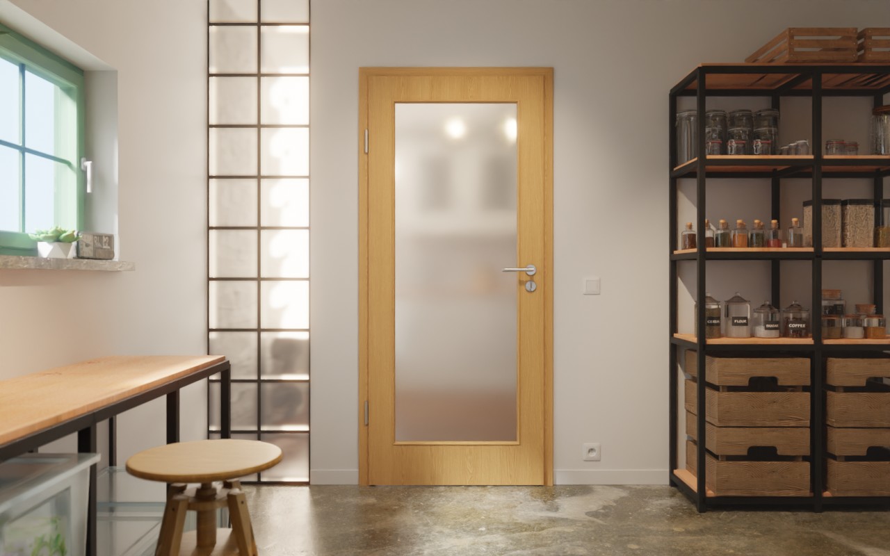 Duże przeszklenie jest centralnym punktem designu drzwi. Oszałamiająco realistyczne usłojenie nadaje dekorowi dąb premium autentyczny wygląd drewna. Materiał CPL zachwyca odpornością na wilgoć i promieniowanie UV.
