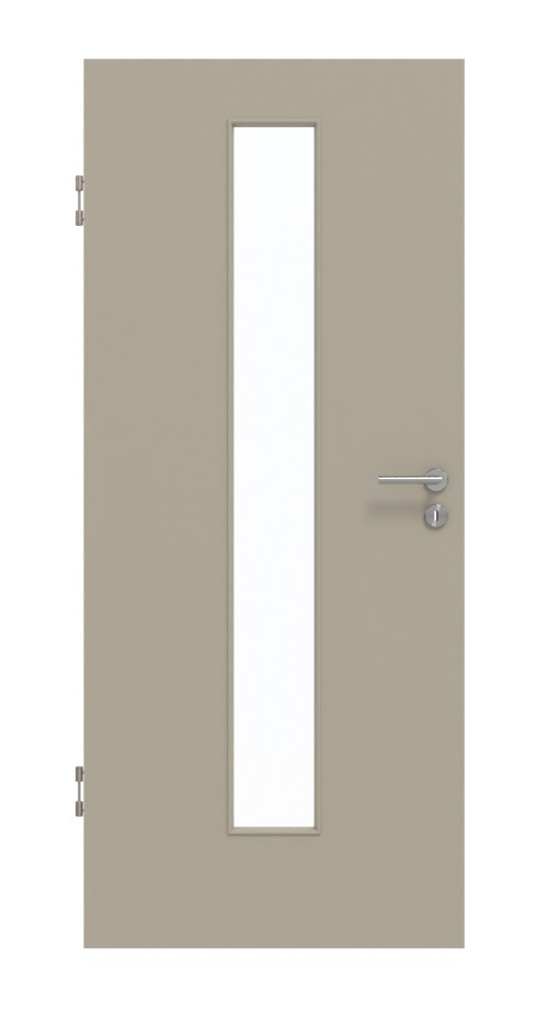 Przez środek skrzydła drzwiowego przebiega wąskie, długie wycięcie na szybę. Wysoce matowa powierzchnia G-TEC w kolorze szarego jedwabiu nie przyjmuje odcisków palców i przekonuje swoim nowoczesnym wyglądem.