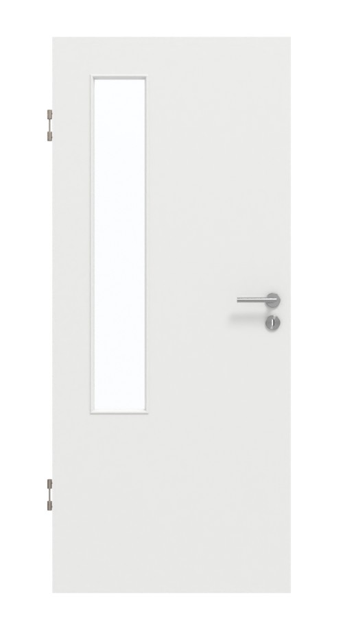 Po stronie zawiasowej skrzydła drzwiowego znajduje się prostokątny otwór okienny . Nowoczesny wygląd zapewnia matowa folia dekoracyjna G-TEC w kolorze białym lakieru 9016, która jednocześnie zapobiega osadzaniu się odcisków dłoni i palców.