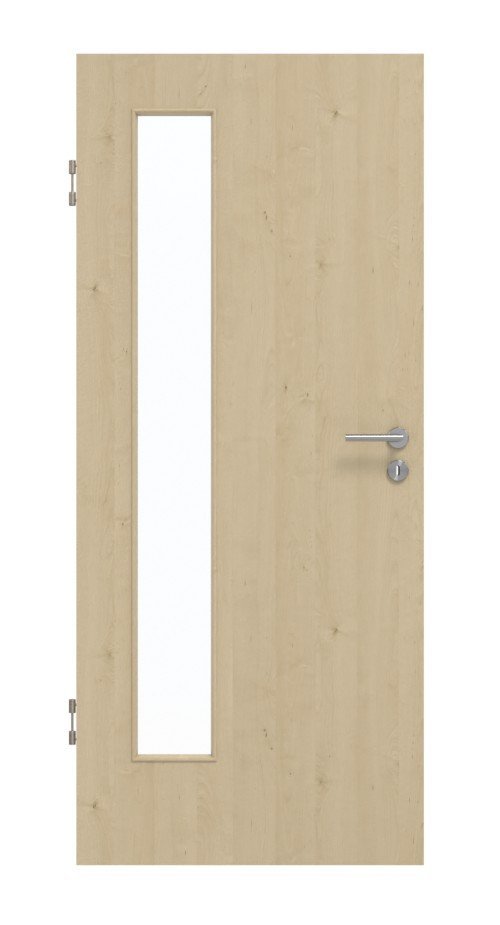 Strona zawiasowa skrzydła drzwiowego zdobi wąski wycięty fragment szyby . Harmonijne usłojenia z niewielką ilością gałęzi podkreślają naturalny wygląd drewna dekoru Natura Ahorn. Powierzchnia CPL jest łatwa w czyszczeniu i mniej wrażliwa na zarysowania i uderzenia.