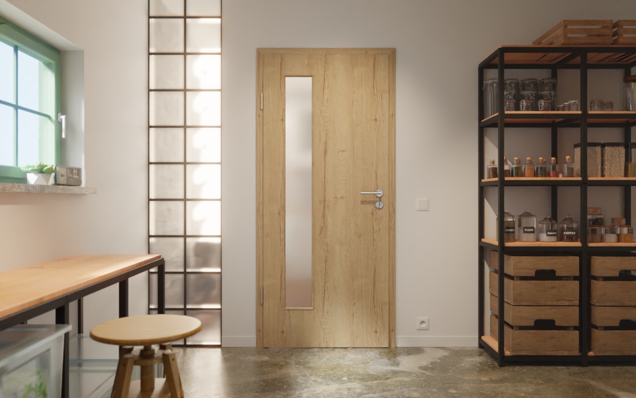 Bok zawiasowy skrzydła drzwi ozdobiony jest wąskim przeszkleniem. Na oszałamiająco realistycznym dekorze CePaL Autentyczny Risseiche rozciągają się wyraźne słoje drewna. Powierzchnia z CPL jest łatwa do czyszczenia i nie zmienia koloru pod wpływem światła UV.