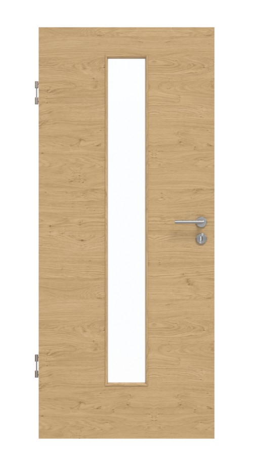 Dokładnie pośrodku skrzydła drzwiowego znajduje się przeszklenie o szerokości prawie 20 cm z zamontowanymi listwami przyszybowymi. Dekor Quer Authentic Asteiche charakteryzuje się żywą strukturą słojów oraz zrównoważoną ilością sęków. Warstwa wierzchnia z CPL jest ponadto łatwa w czyszczeniu i nie ulega odbarwieniu pod wpływem promieniowania UV.
