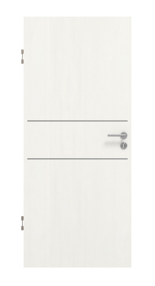 Dwie poziome listwy podkreślają środek skrzydła drzwiowego i nadają klamce wyjątkowy wygląd. Dekor Authentic Bianco zachwyca delikatnym usłojeniem i jasnym odcieniem. Oprócz przyjemnego designu powierzchnia CPL przekonuje również swoją odpornością na uderzenia, zarysowania i ścieranie. Jest odporna na plamy i łatwa w czyszczeniu.
