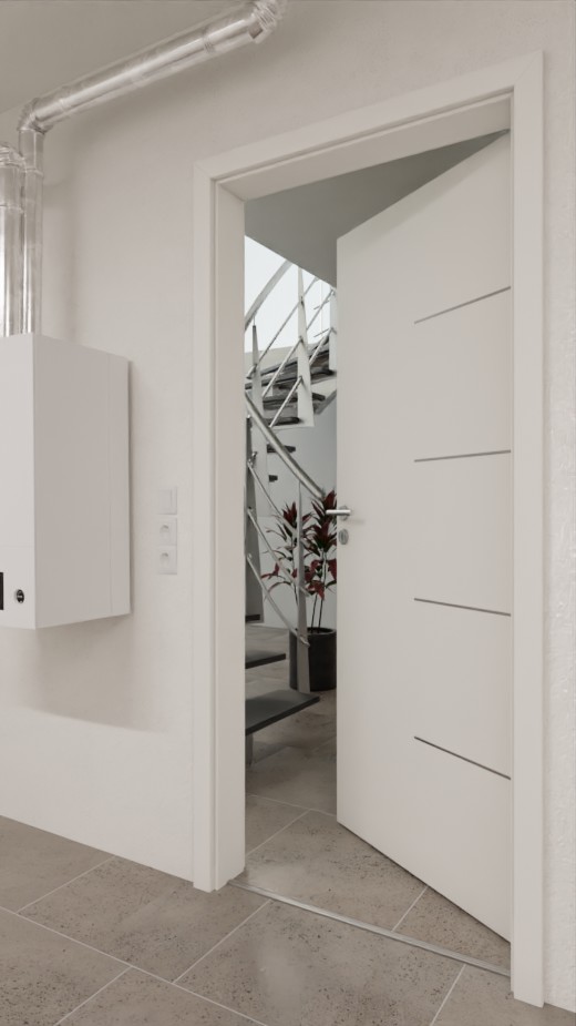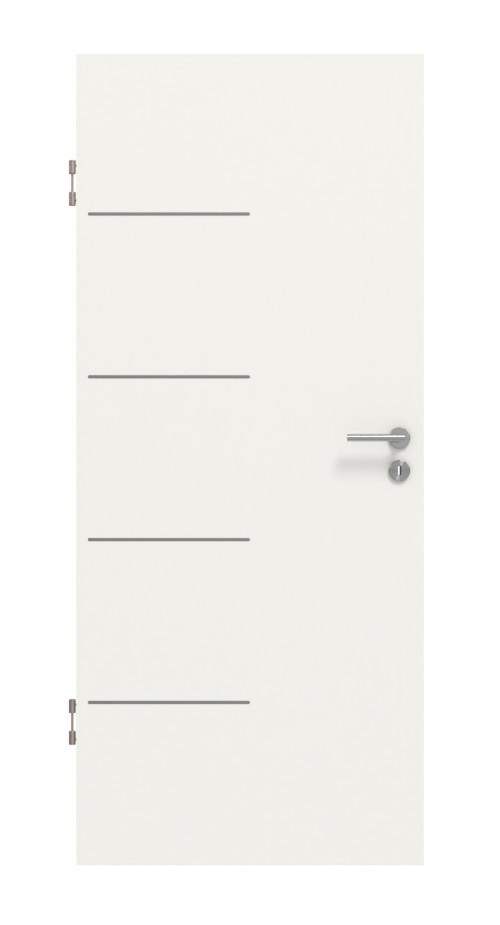 Cztery eleganckie lizeny rozciągają się po stronie zawiasów do środka skrzydła drzwiowego. Neutralny dekor w kolorze białym 9016 jest zintegrowany z każdym wnętrzem. Powłoka CPL zachwyca swoją odpornością na zabrudzenia i wysoką temperaturę. Są łatwe w czyszczeniu i odporne na uderzenia i zarysowania.