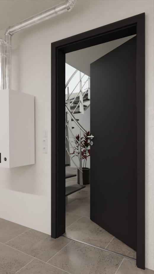 Solidne drzwi termoizolacyjne z opadającą uszczelką podłogową i wartością U wynoszącą około 1,1 W/m²K: