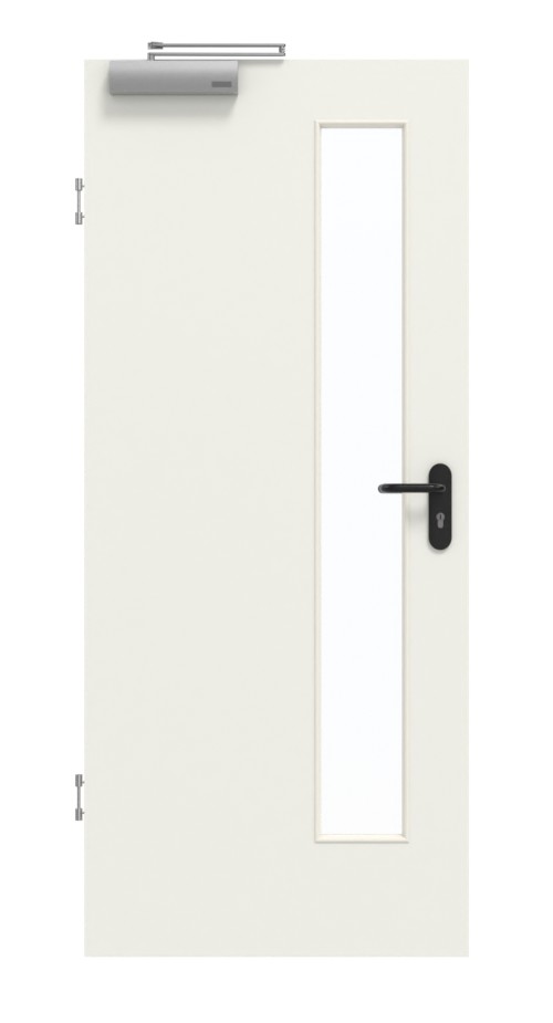 Skrzydło drzwiowe, zawiasy, zamek cylindryczny, przeszklenie, samozamykacz, obniżana uszczelka podłogowa, czarny plastikowy uchwyt.
