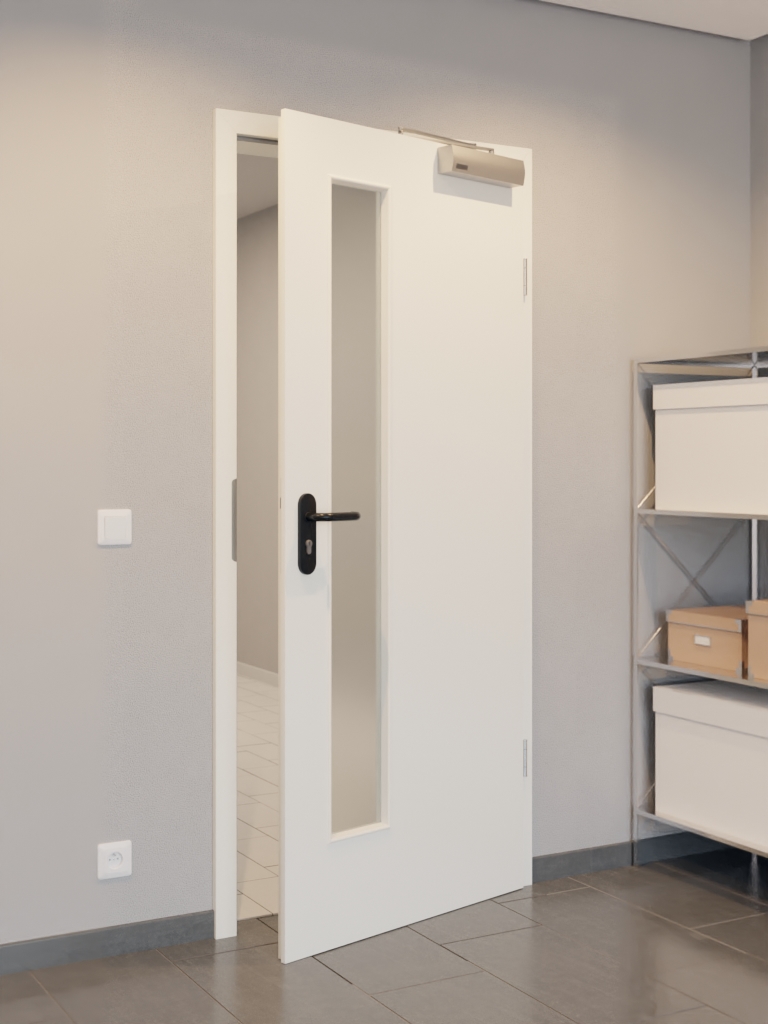 Wnętrze konstrukcji jest dopracowane pod względem technicznym i wyposażone w stabilizującą ramę z litego drewna oraz płytę wiórową pełną. Konstrukcję uzupełnia płyta wierzchnia HDF o grubości 3 mm oraz – zgodnie z normą DIN 18095 – samozamykacz drzwiowy górny i opuszczana uszczelka podłogowa.