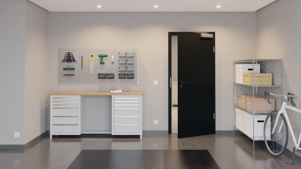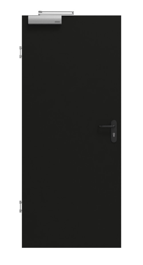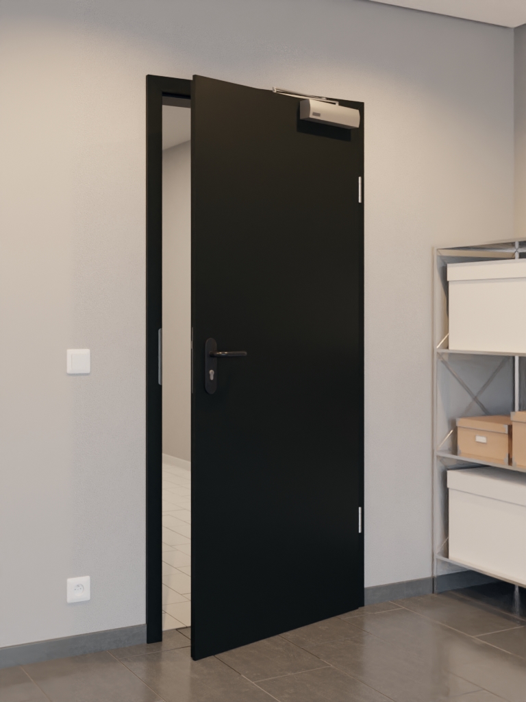 Pomieszczenie wewnętrzne drzwi składa się z ramy z drewna litego ze stabilizatorem, płyty wiórowej pełnej oraz warstwy wierzchniej z płyty pilśniowej o grubości 3 mm i wysokiej gęstości. Samozamykacz drzwiowy górny i opuszczana uszczelka podłogowa uzupełniają drzwi zgodnie z wymaganiami normy DIN 18095 dla drzwi dymoszczelnych.