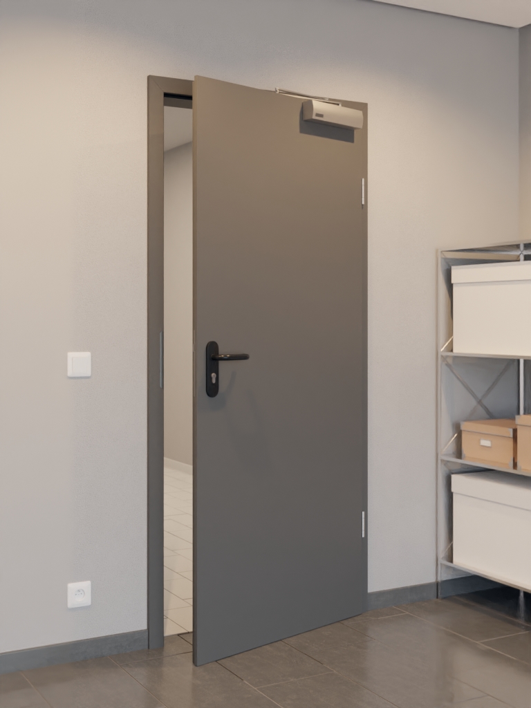 Stabilność pomieszczenia wewnętrznego zapewnia konstrukcja z ramy z drewna litego ze stabilizatorem i płytą wiórową pełną. Jako warstwa wierzchnia stosowana jest płyta pilśniowa o grubości 3 mm i wysokiej gęstości. Zgodnie z normą DIN 18095 dotyczącą drzwi dymoszczelnych konstrukcję uzupełnia samozamykacz drzwiowy górny i opuszczana uszczelka podłogowa.