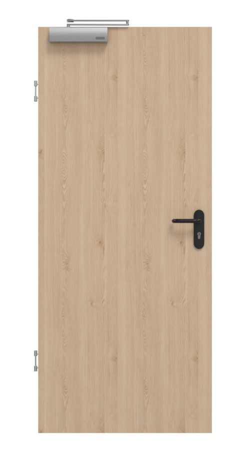Pomieszczenie wewnętrzne drzwi składa się z ramy z drewna litego ze stabilizatorem, płyty wiórowej pełnej oraz warstwy wierzchniej z płyty pilśniowej o grubości 3 mm i wysokiej gęstości. Samozamykacz drzwiowy górny i opuszczana uszczelka podłogowa uzupełniają drzwi zgodnie z wymaganiami normy DIN 18095 dla drzwi dymoszczelnych.