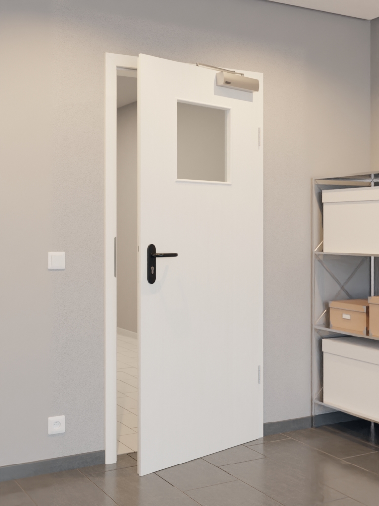 Konstrukcja składa się z ramy z litego drewna ze stabilizatorem, płyty wiórowej pełnej oraz płyty HDF o grubości 3 mm i wysokiej gęstości jako warstwy wierzchniej. W połączeniu z samozamykaczem drzwiowym górnym i opuszczaną uszczelką podłogową drzwi spełniają wymagania normy DIN 18095 dotyczącej drzwi dymoszczelnych.